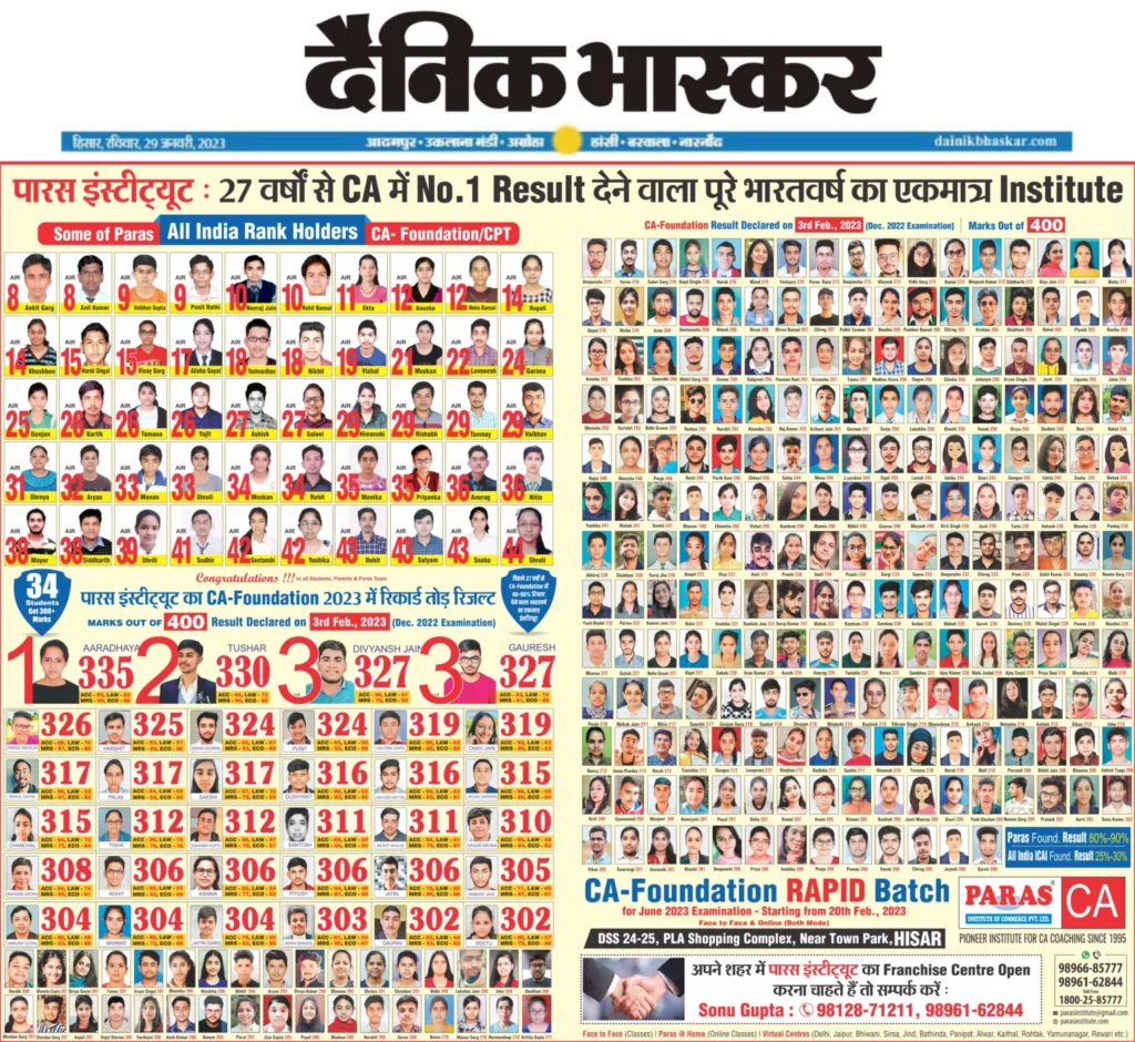 The finest CA Foundation classes in India are provided by Paras Institute of Commerce. Paras Institute of Commerce provides admission to only limited students in CA Foundation and attempts to make sure that every student passes. Because CA Foundation 2 Papers are subjective like Intermediate Papers, we educate CA Foundation students on how to solve them. Additionally, we admit deserving students to the Rapid Batch of the Paras Institute of Commerce Intermediate for them to achieve high rankings on the CA Intermediate test, which is regarded as the most difficult exam. As a consequence, Paras Institute of Commerce has been awarded top rankings for the past 27 years.